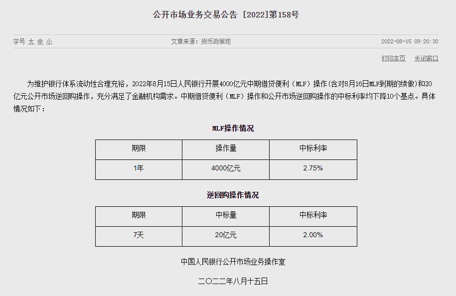 此次下調(diào)是自2022年1月以來,央行時隔7個月來再度下調(diào)MLF和公開市場逆回購利率,貨幣政策寬松力度超出市場預(yù)期。隨著此次MLF和公開市場逆回購利率的調(diào)整,各界人士紛紛預(yù)測8月貸款市場報價利率(LPR)將同步下調(diào),皆因