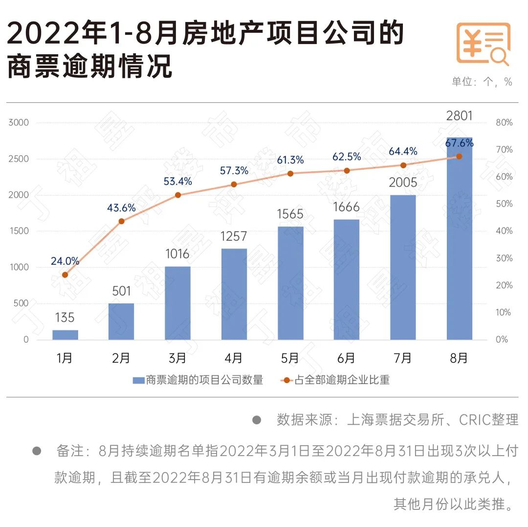 根據(jù)上海票交所公布的《截至2022年8月31日的持續(xù)逾期名單》,CRIC統(tǒng)計(jì)發(fā)現(xiàn),存在商票逾期的房地產(chǎn)項(xiàng)目公司數(shù)量環(huán)比大幅增長約四成,至8月共計(jì)2801個房地產(chǎn)項(xiàng)目公司存在商票逾期現(xiàn)象。