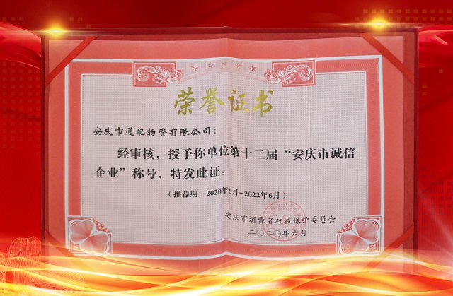 2020年8月17日下午,在安慶市市場(chǎng)監(jiān)管局九樓西會(huì)議室,舉行第十二屆“安慶市誠信企業(yè)”授牌儀式,此次評(píng)選結(jié)果是經(jīng)各縣(市)、區(qū)消保委推薦,通過征詢,經(jīng)市消保委各成員單位審議,網(wǎng)站公示,市消保委實(shí)地核查后,共有25家企業(yè)入圍,安慶市通配物資有限公司以其突出的綜合實(shí)力和良好的社會(huì)口碑榮獲第十二屆“安慶市誠信企業(yè)”榮譽(yù)稱號(hào)。